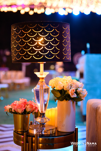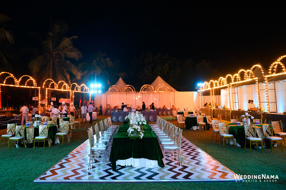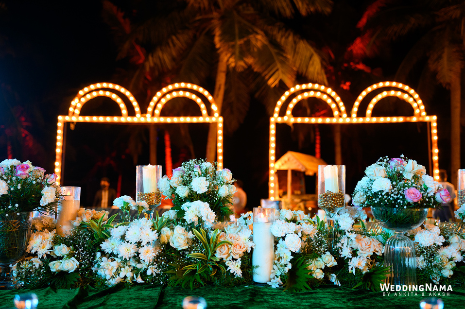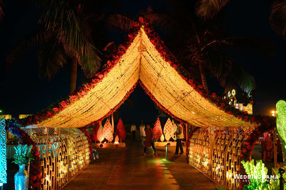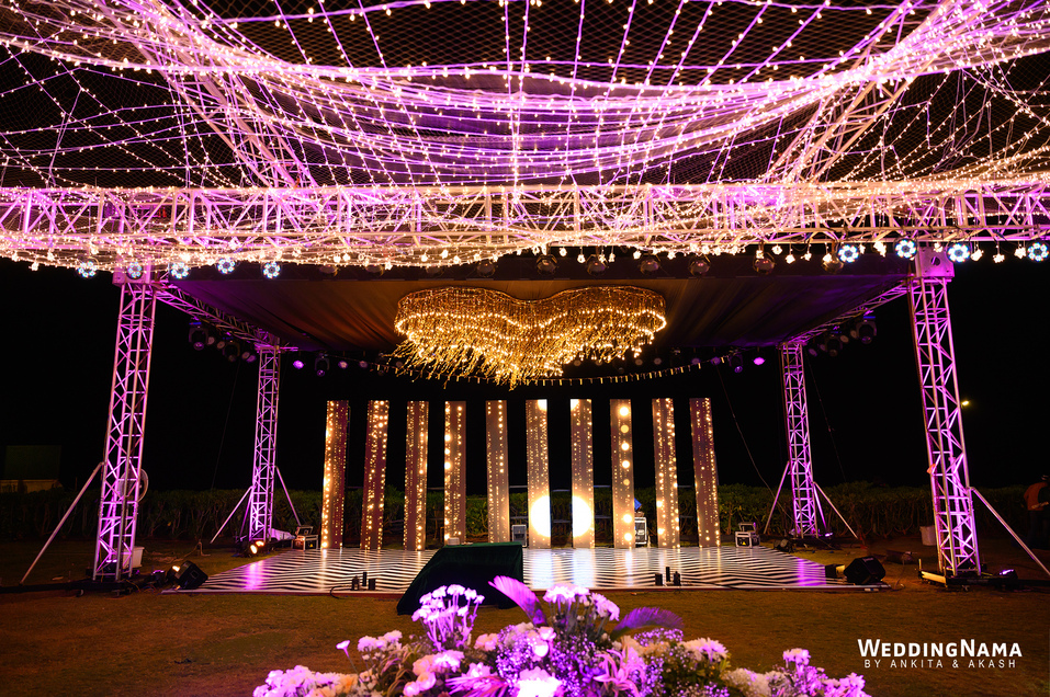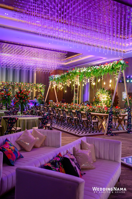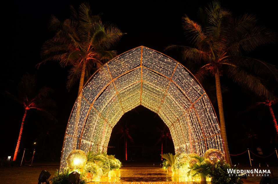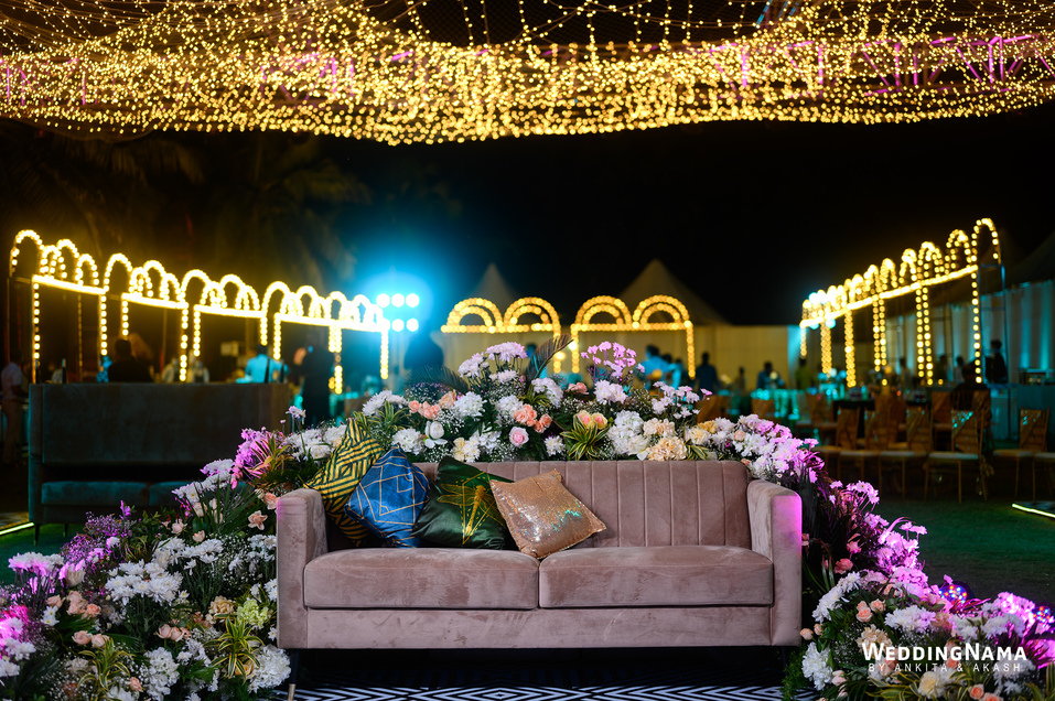 Sangeeth: This festivity was planned with a beautiful tunnel of lights matched with reflective flooring and the cosmic blanket of lights. Grand couple entry and paparazzi gimmick at the entrance gave each one a starry vibe.