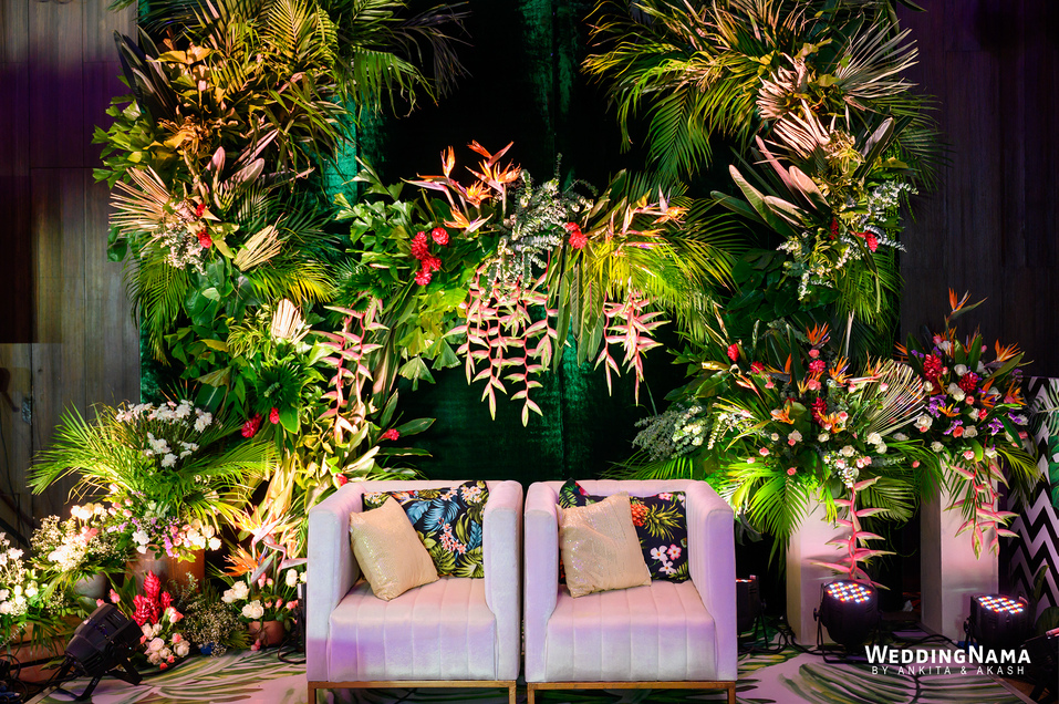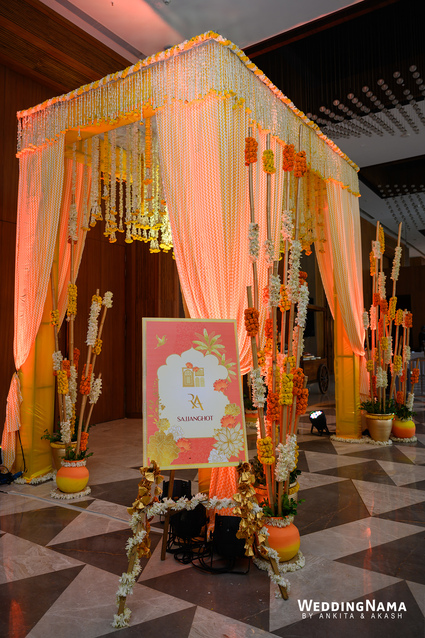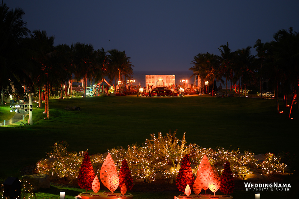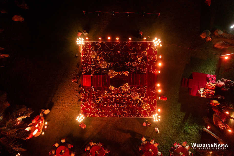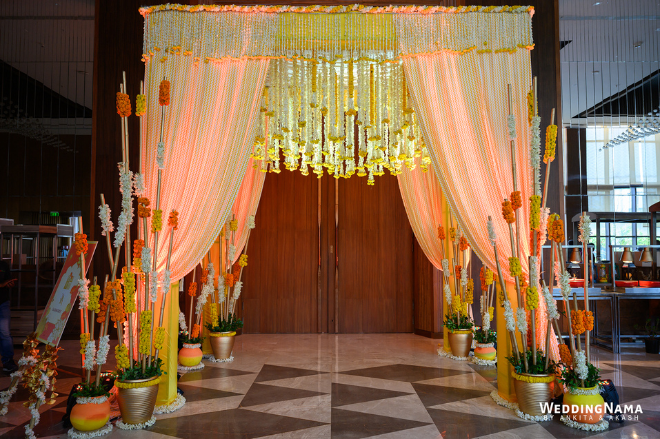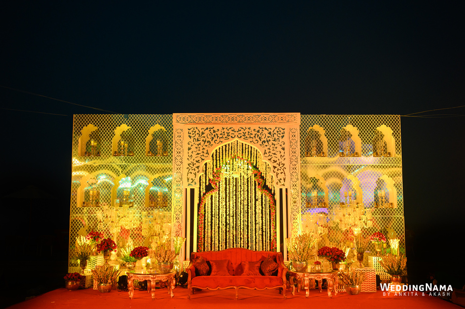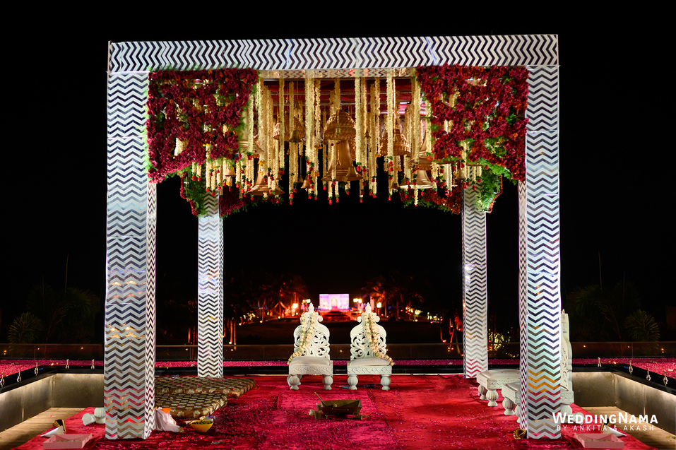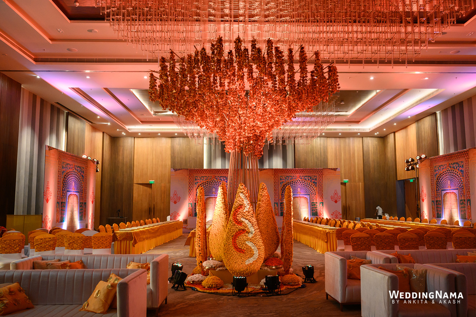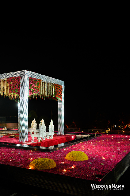 Royal Wedding: From the famous Jea Band to the beautiful bridal entry in floral palki along with the props and dancers and the royal groom entry. This evening had royal written all over it. The multiple layered grand Varmalla set up along with the special effects, the traditional mandap and the floral décor around it were executed perfectly as