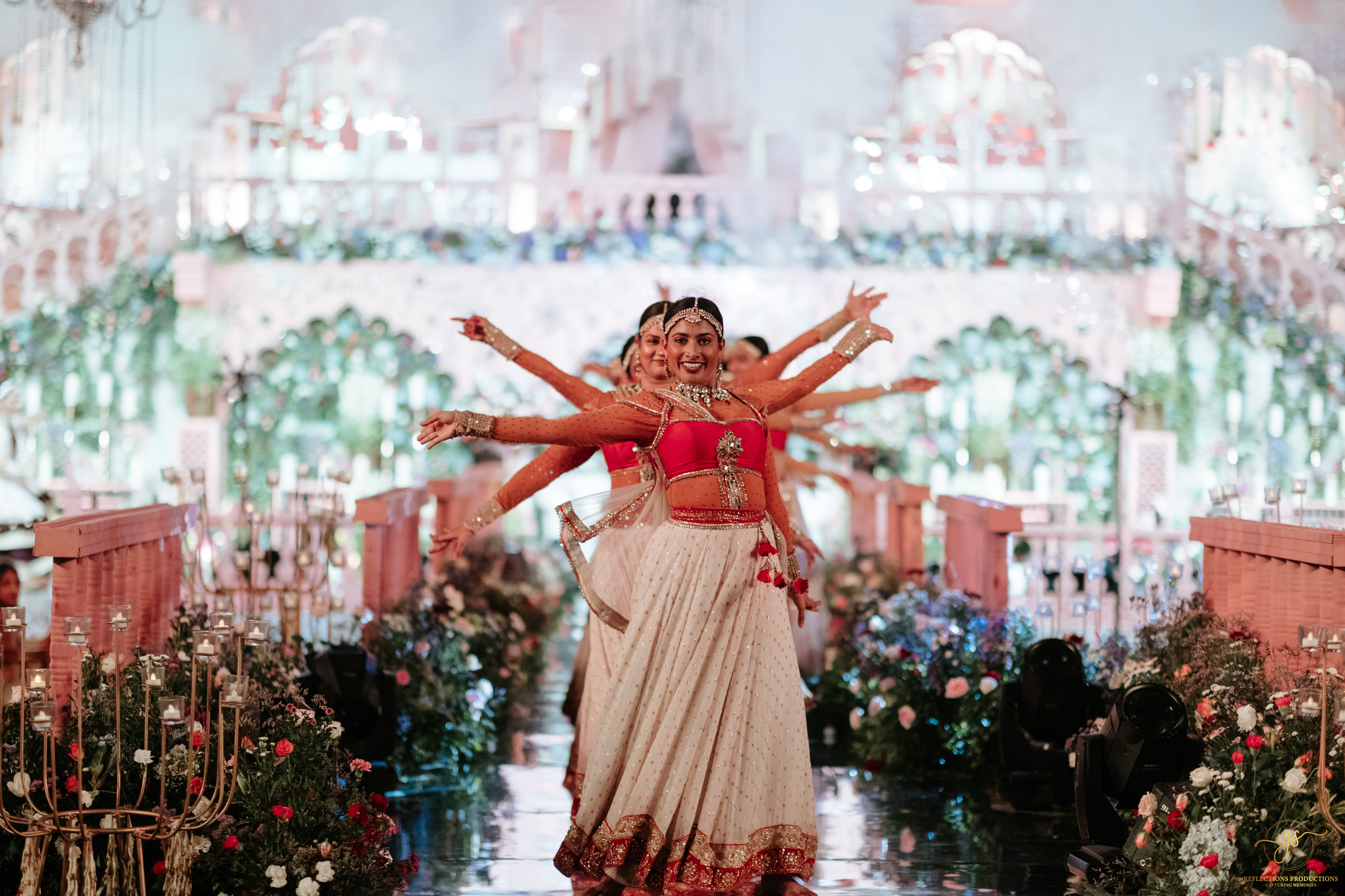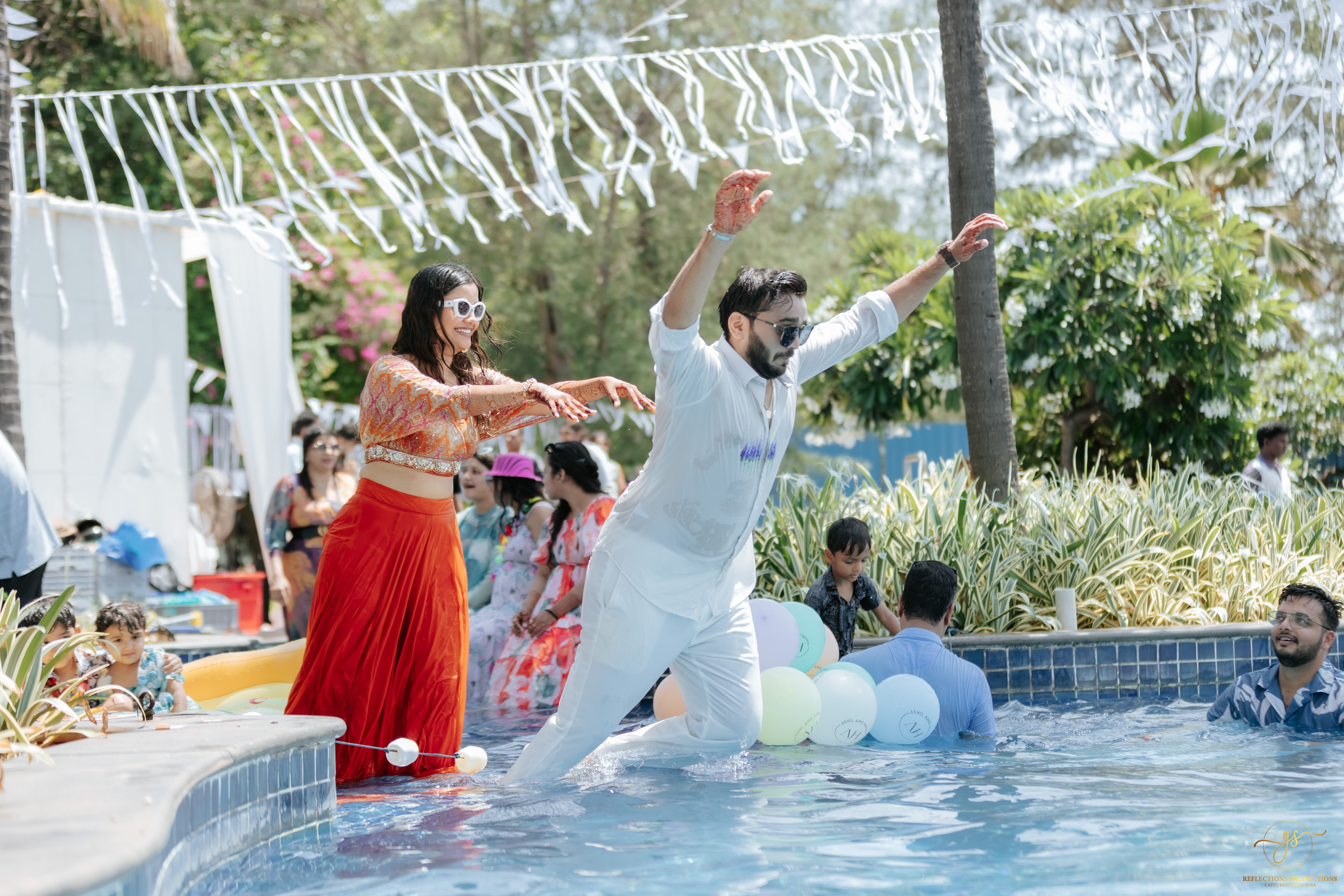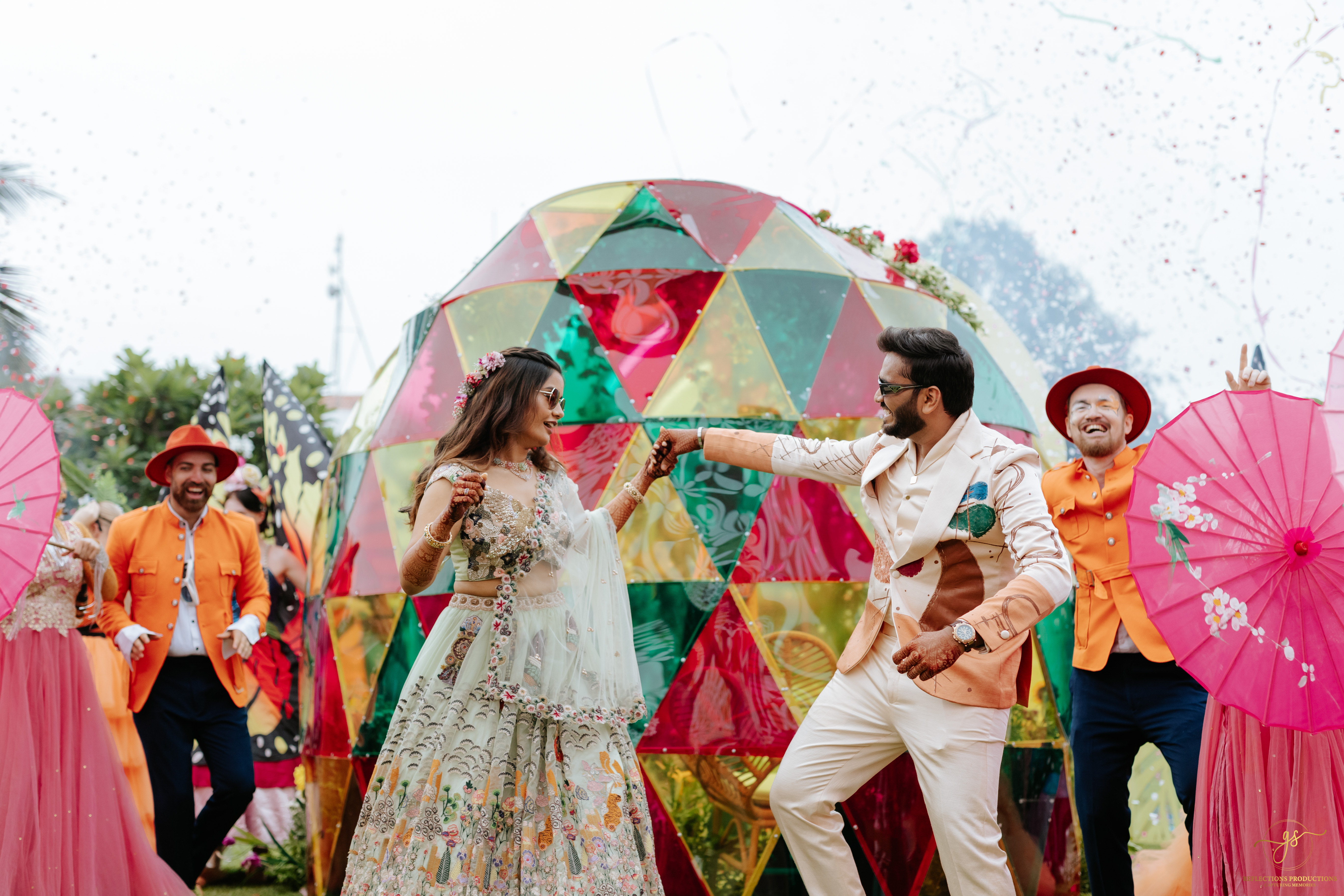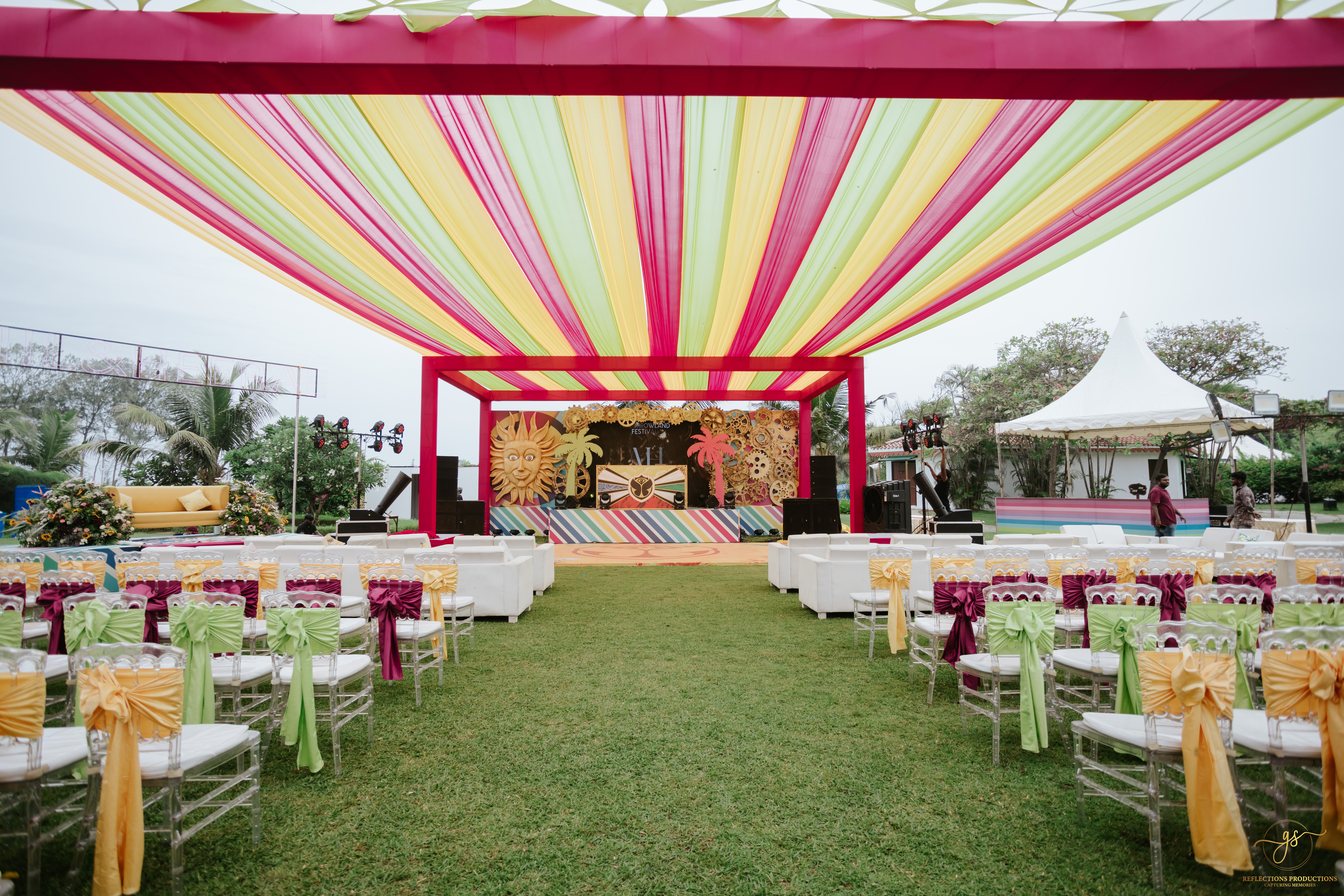 Our events included a South Indian-themed check-in lunch, a Tomorrowland carnival high tea, an awards night and sangeet in the evening, and a white pool party the following morning. The celebrations continued with the Baraat, Varmala, Reception, and Phera ceremonies.